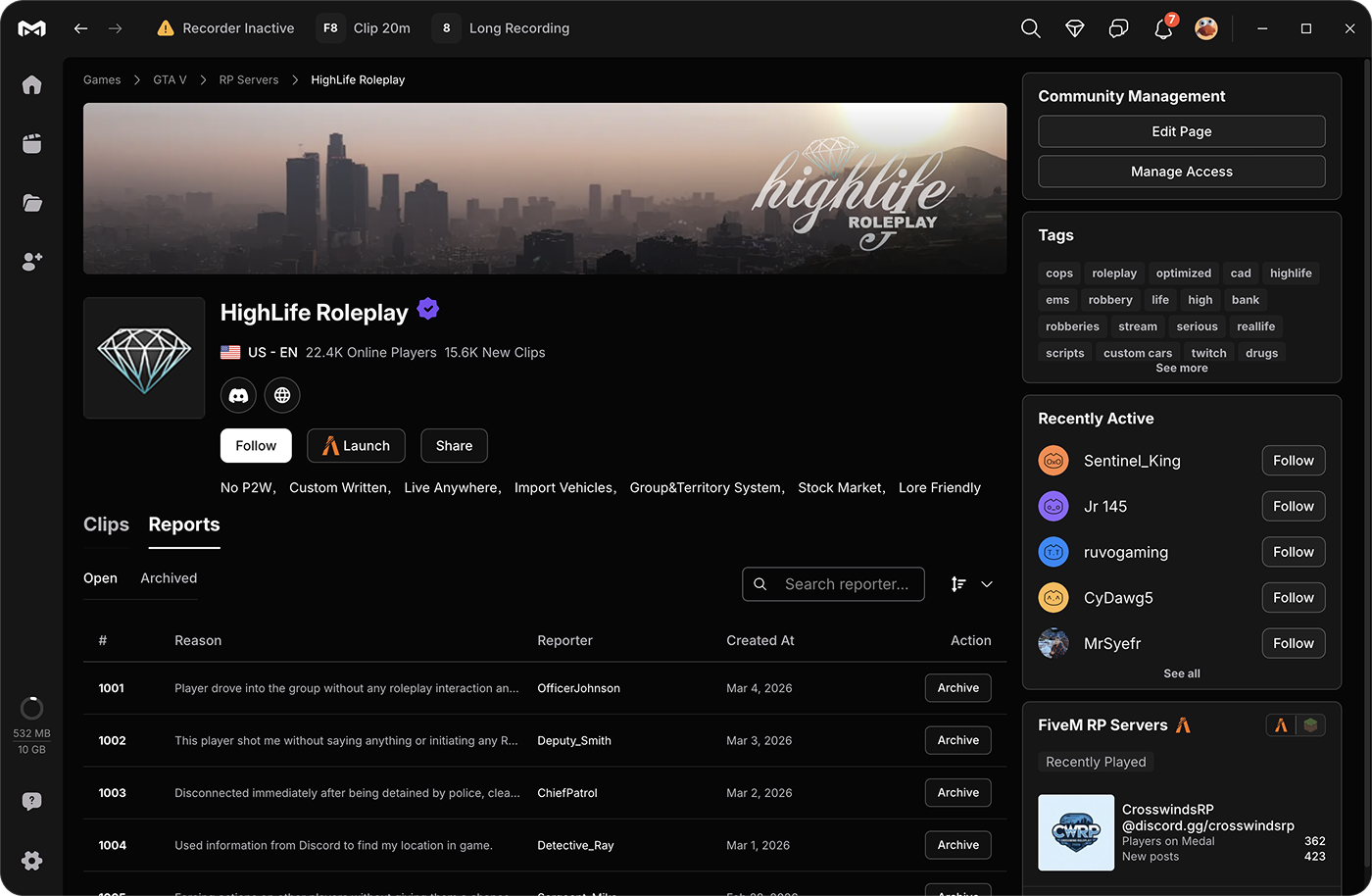 Need something that just works, and is convenient to access? Server admins can choose to manage incoming reports within the Medal app from their FiveM server page. This is perfect for servers who need or want a place to review and archive reports, especially smaller servers who don’t have the staff, tools, time, or existing ecosystem to build one from the ground up.