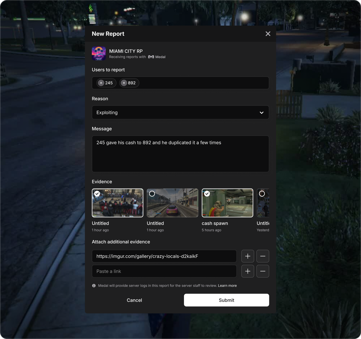 A common request was a way to report directly in-game without breaking immersion and needing to tab out to Discord, log in on the server’s forum, or navigate to whatever other reporting methods. The next version of our free FiveM resource will add a `/report` command which opens a handy interface to allow players to submit reports from directly within the server. You can attach recent Medal clips, as well as links to any additional external evidence you may have to back up your report.